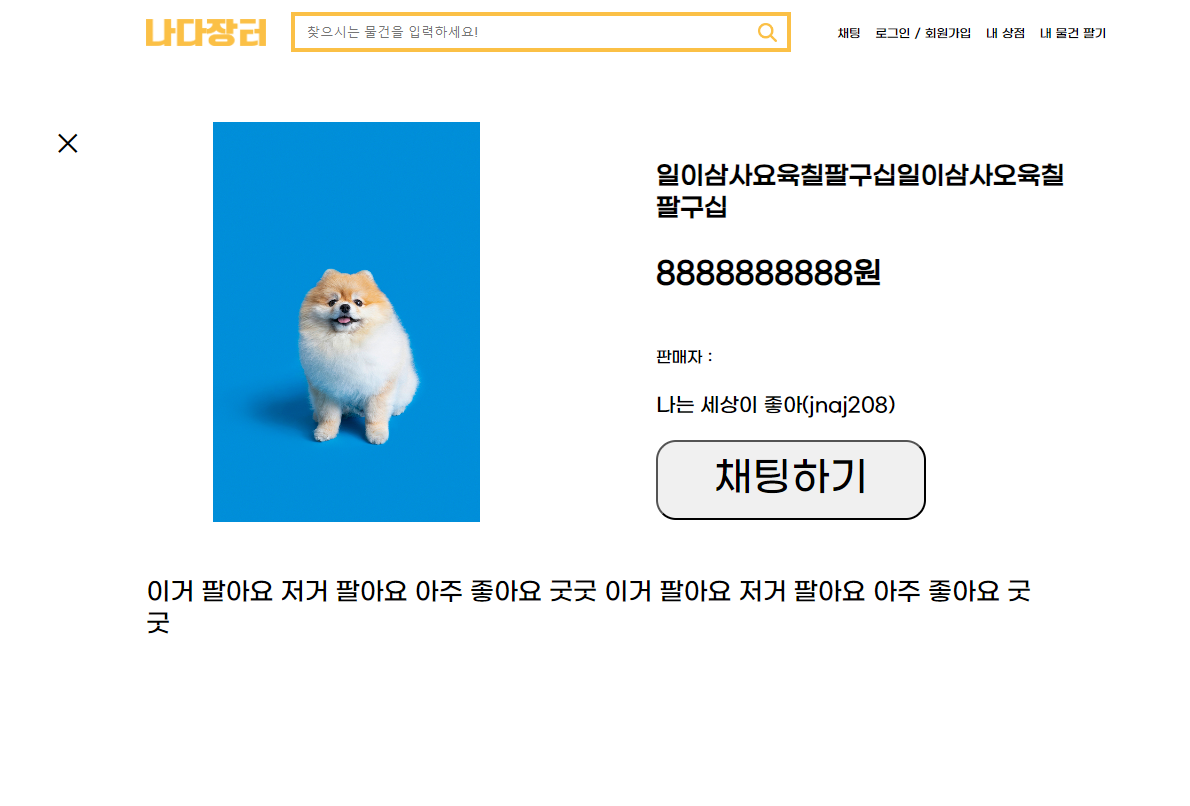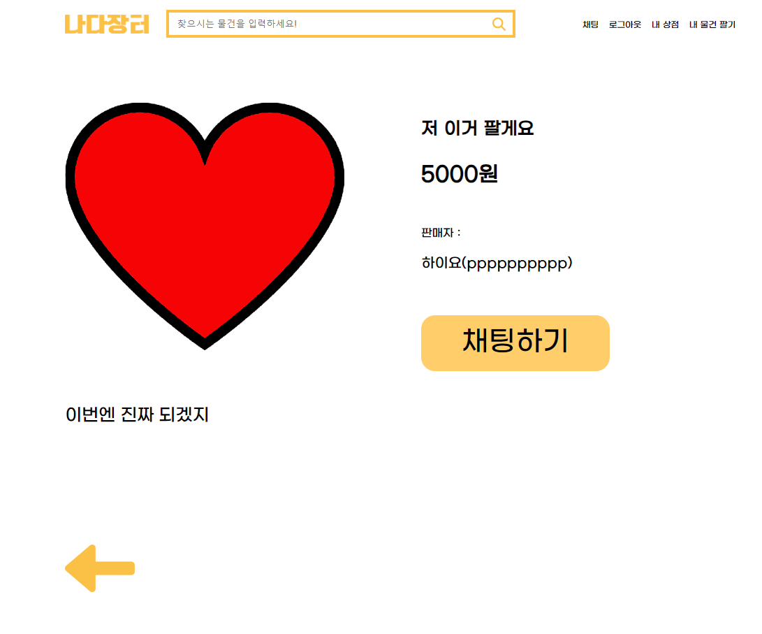 2. 상품 상세 페이지에서 판매자, 제목, 내용, 가격을 보고 채팅을 걸 수 있고, 찜을 할 수 있다(홈으로 돌아가는 버튼도).