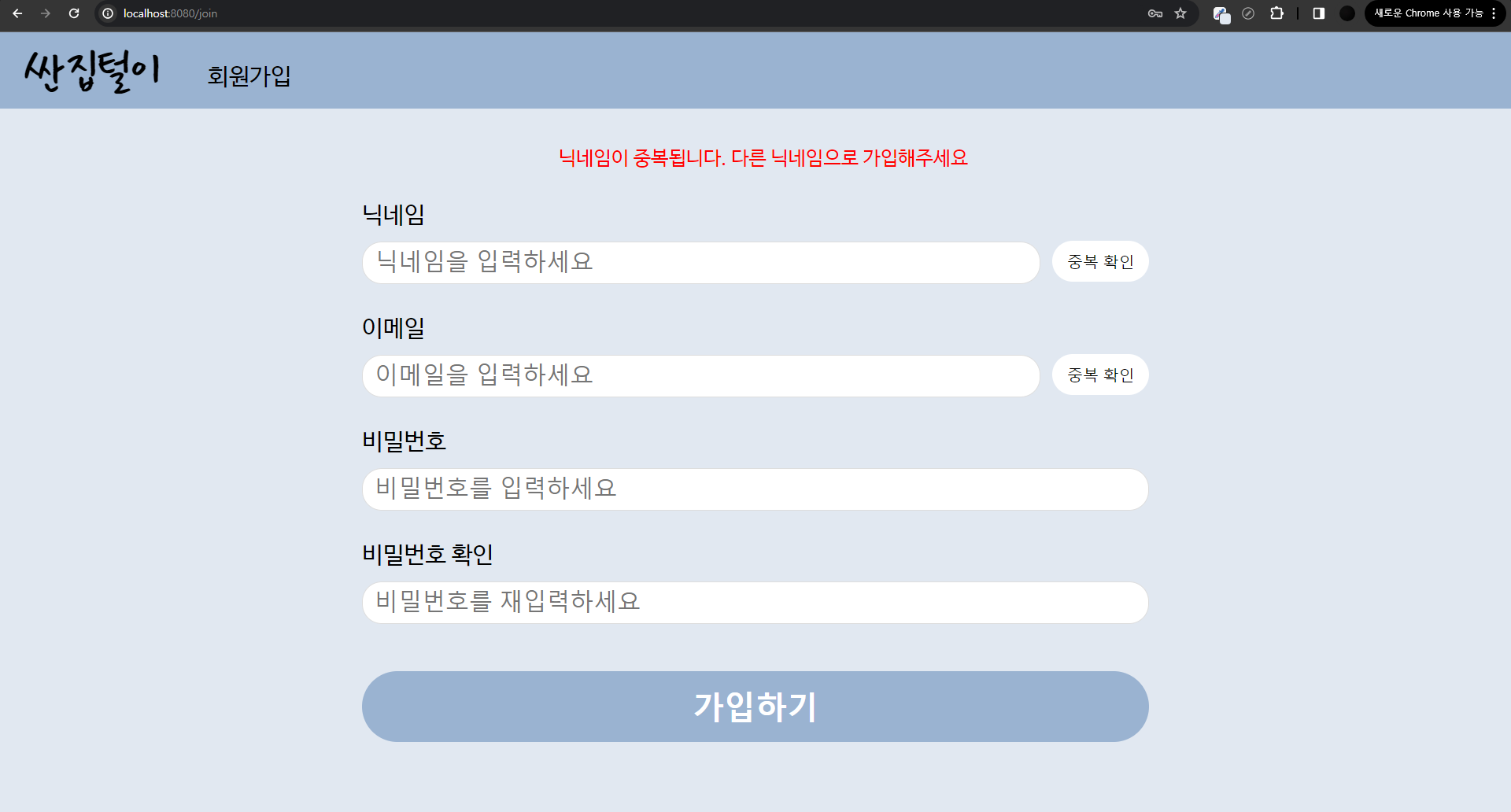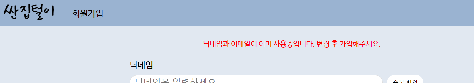 else{응답.render('join.ejs', {data : '닉네임과 이메일이 이미 사용중입니다. 변경 후 가입해주세요.'})}