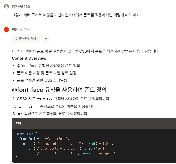 콘솔에 꽂혀서 뤼튼에게 서버 코드와 get 요청한 url만 보여주면서 왜 글씨체를 뱉는지 물어봤을 때