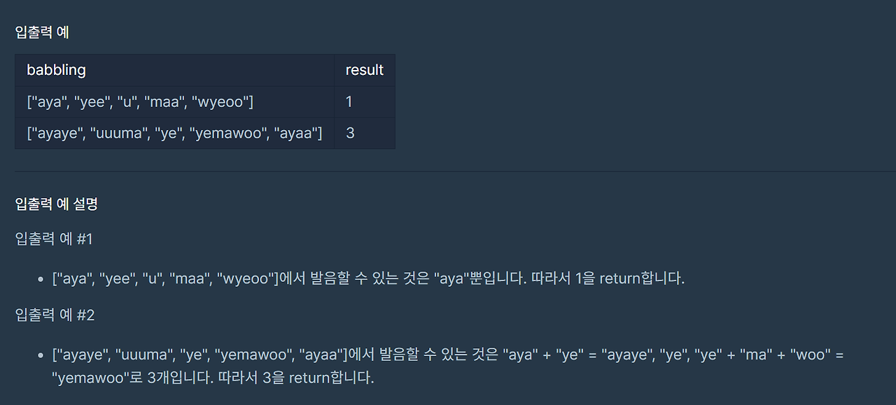 입력된 배열에서 "aya", "ye", "woo", "ma" 들이 최대 1번씩만 포함돼서 이것들로만 이루어진 문자의 개수를 내뱉어야 한다.